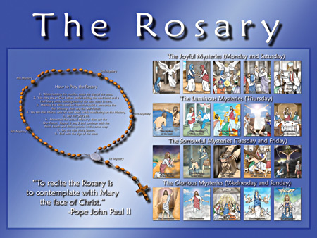 This simple wall chart offers colorful pictures for each mystery of the Rosary (Joyful, Luminous, Sorrowful and Glorious are included) along with an illustrated explanation of how to say the Rosary. Each mystery of the Rosary is labeled along with which days of the week to say each set of mysteries.